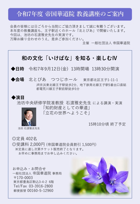 令和7(2025)年度『教養講座:「いけばな」を知る・楽しむⅣ』を次のとおり開催いたします。