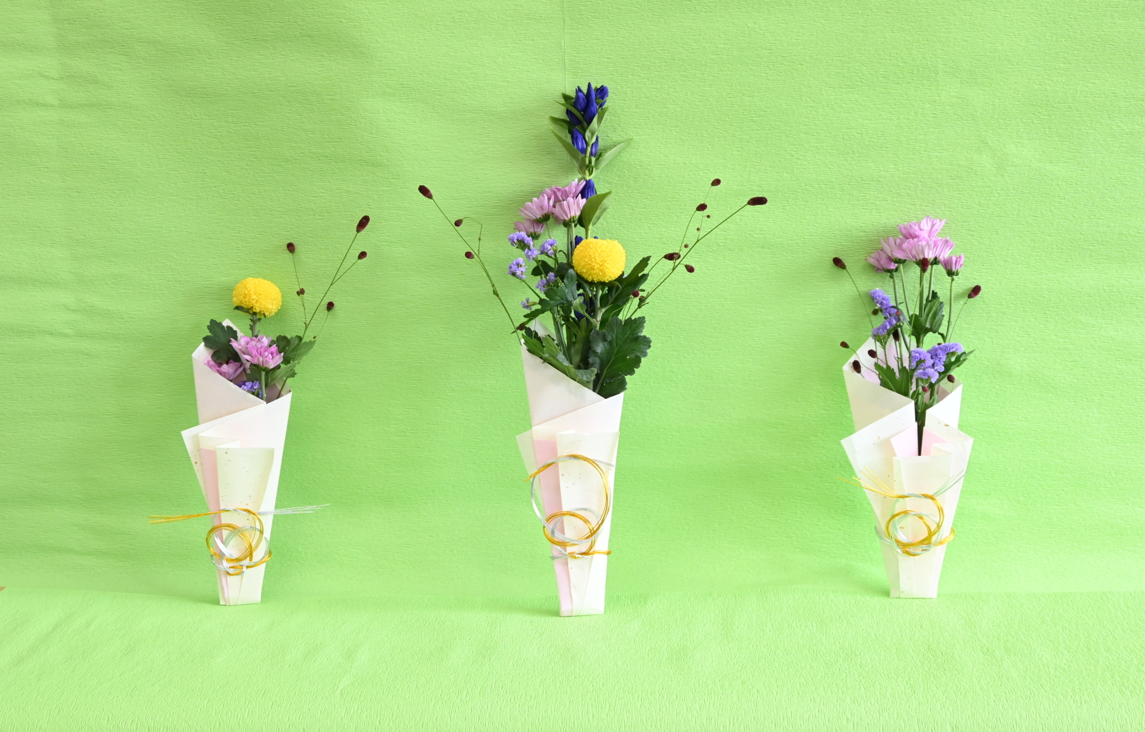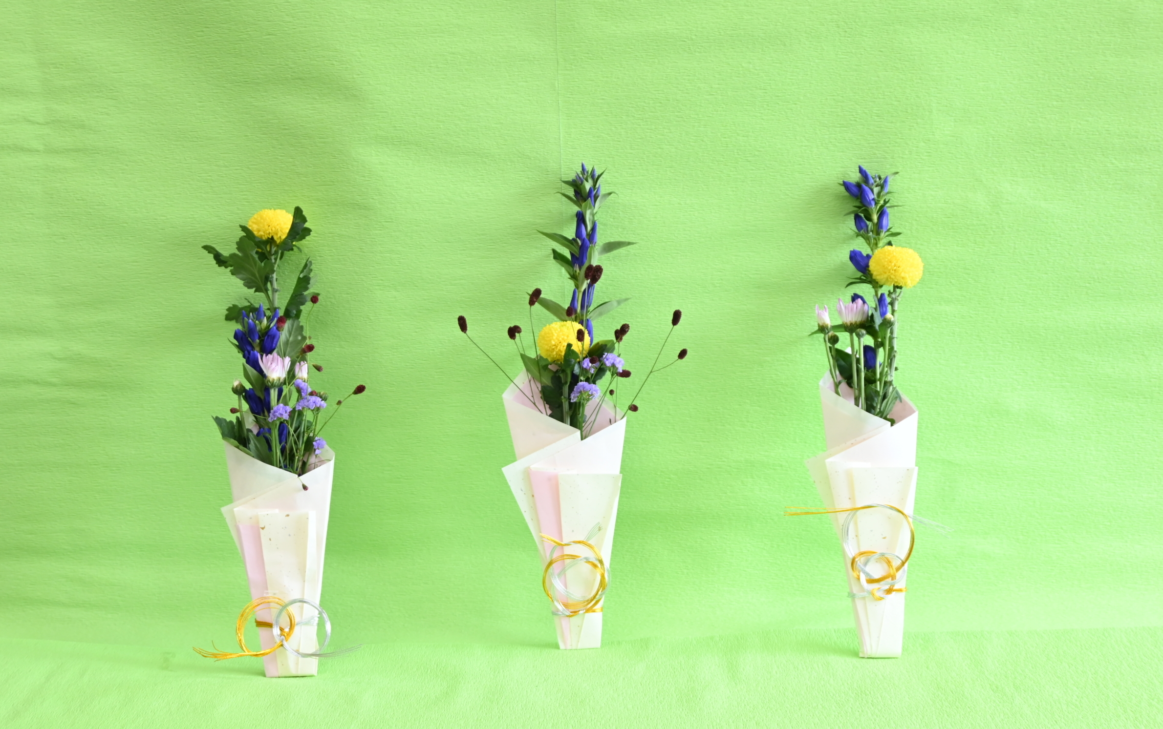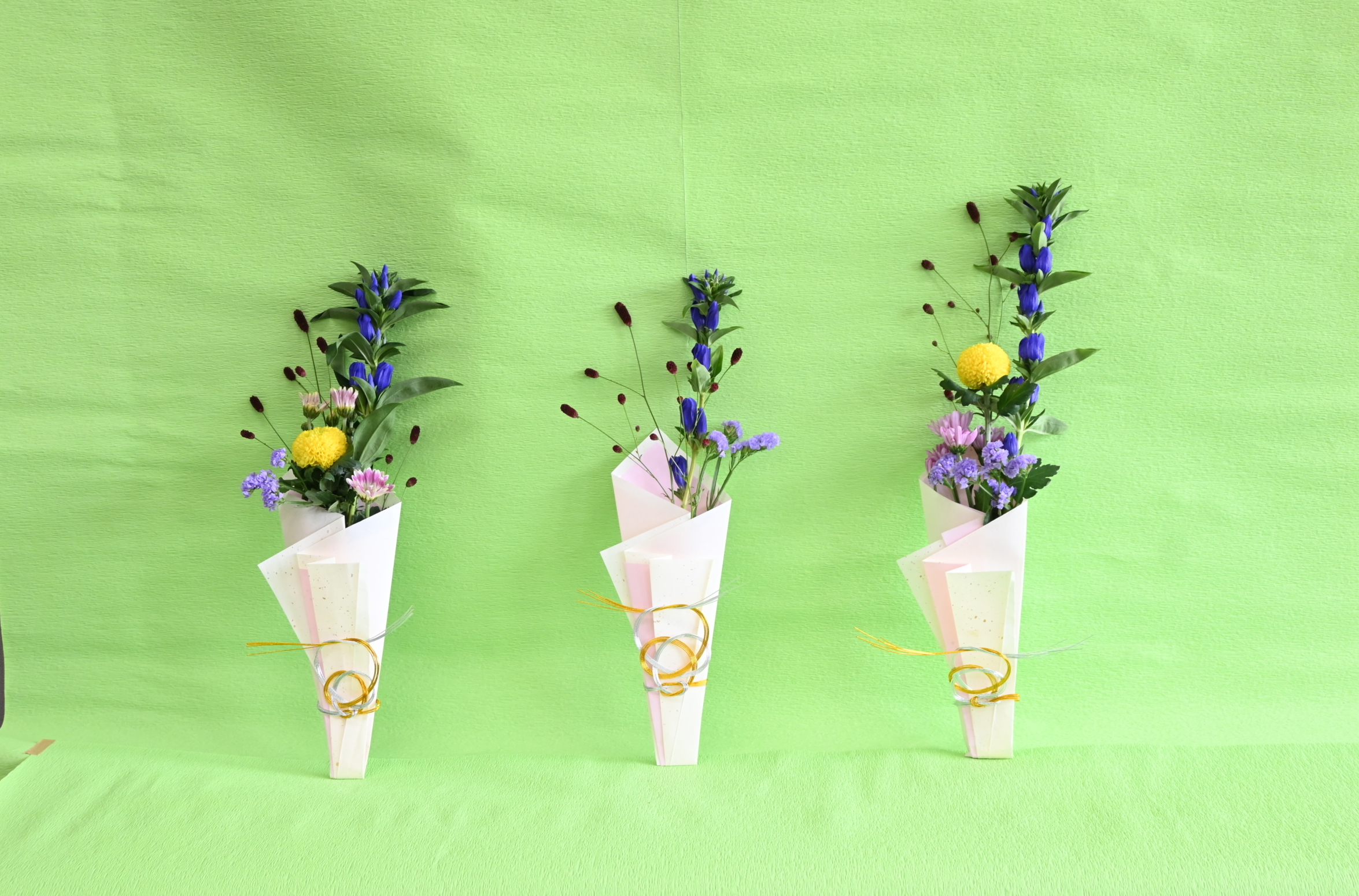 花材はリンドウ、ピンポンマム、PSPマム、ワレモコウ、スターチスです。