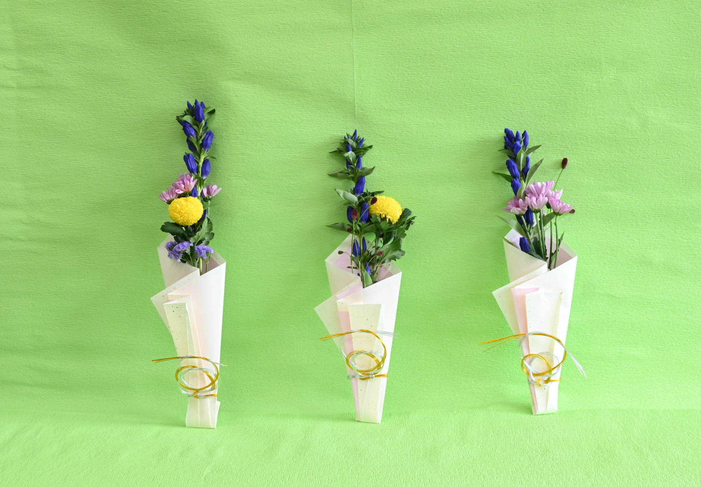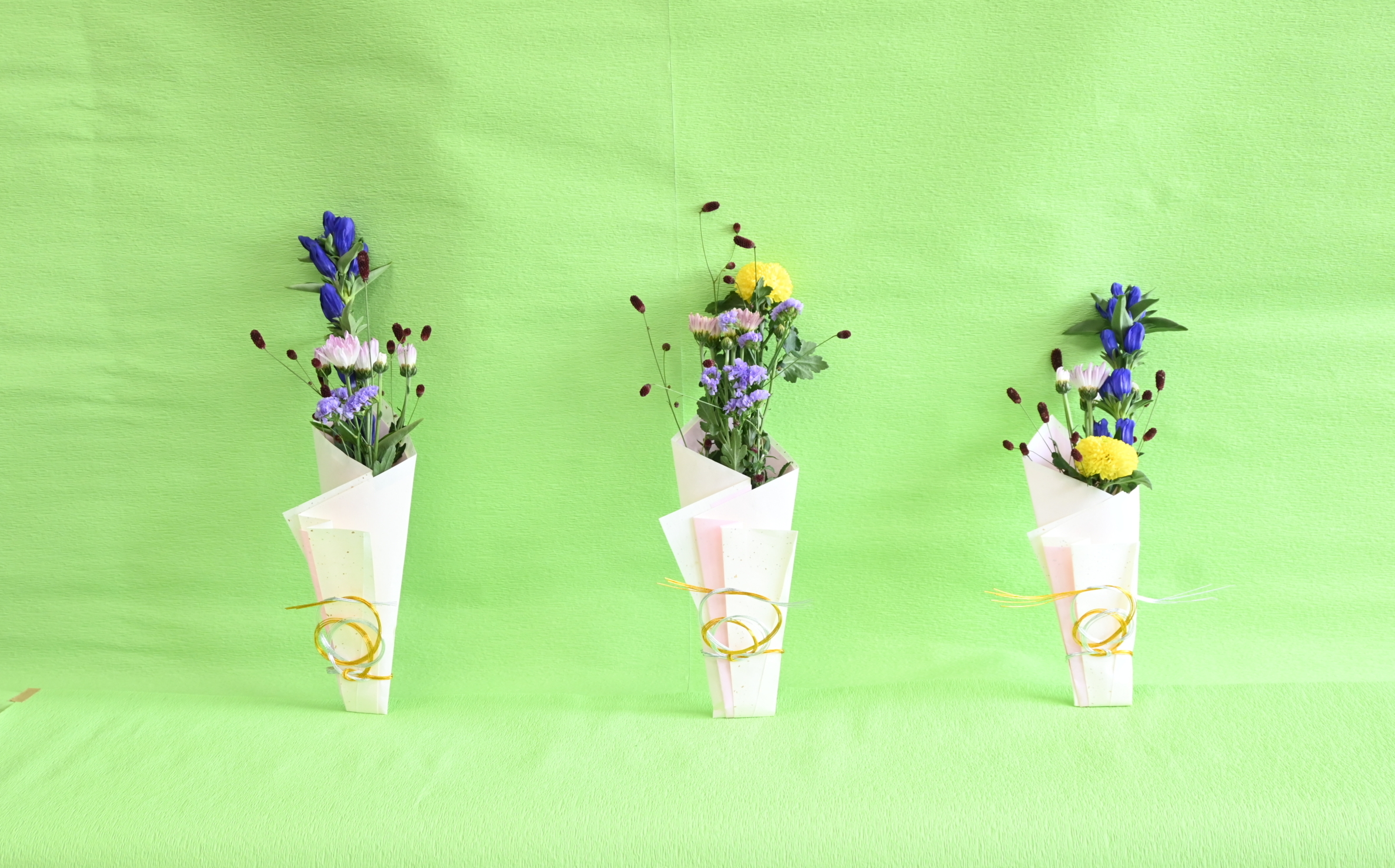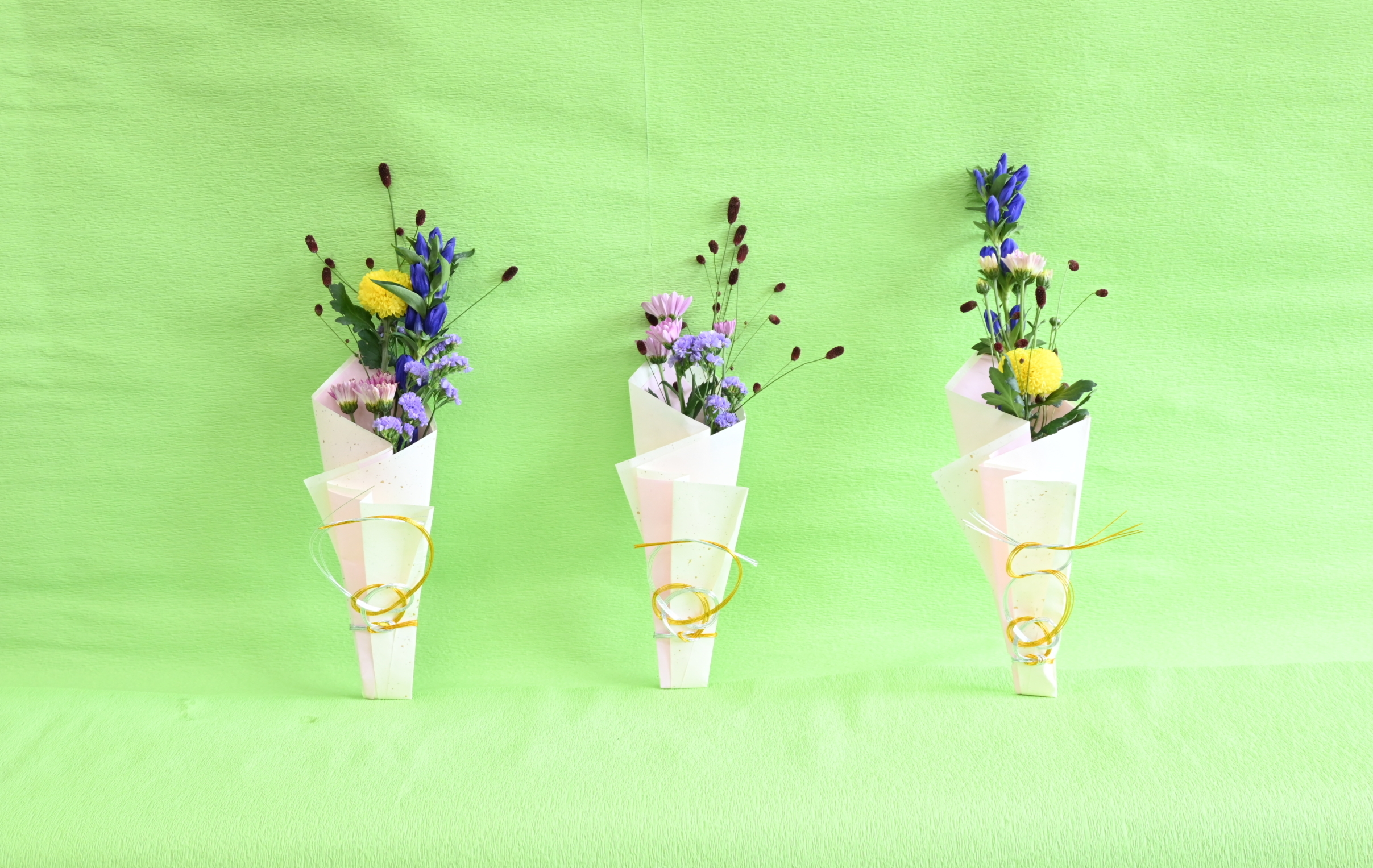 花材はリンドウ、ピンポンマム、PSPマム、ワレモコウ、スターチスです。