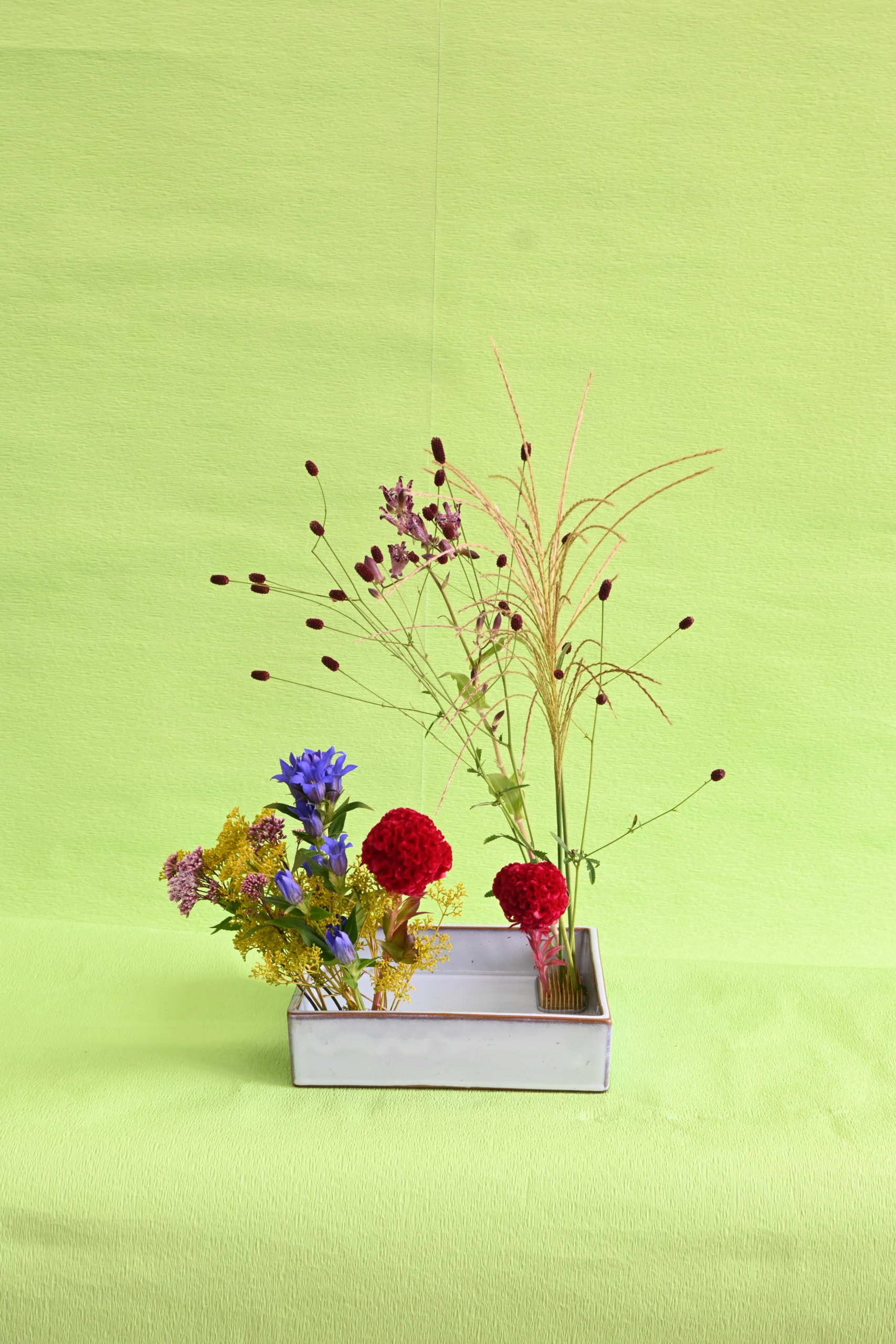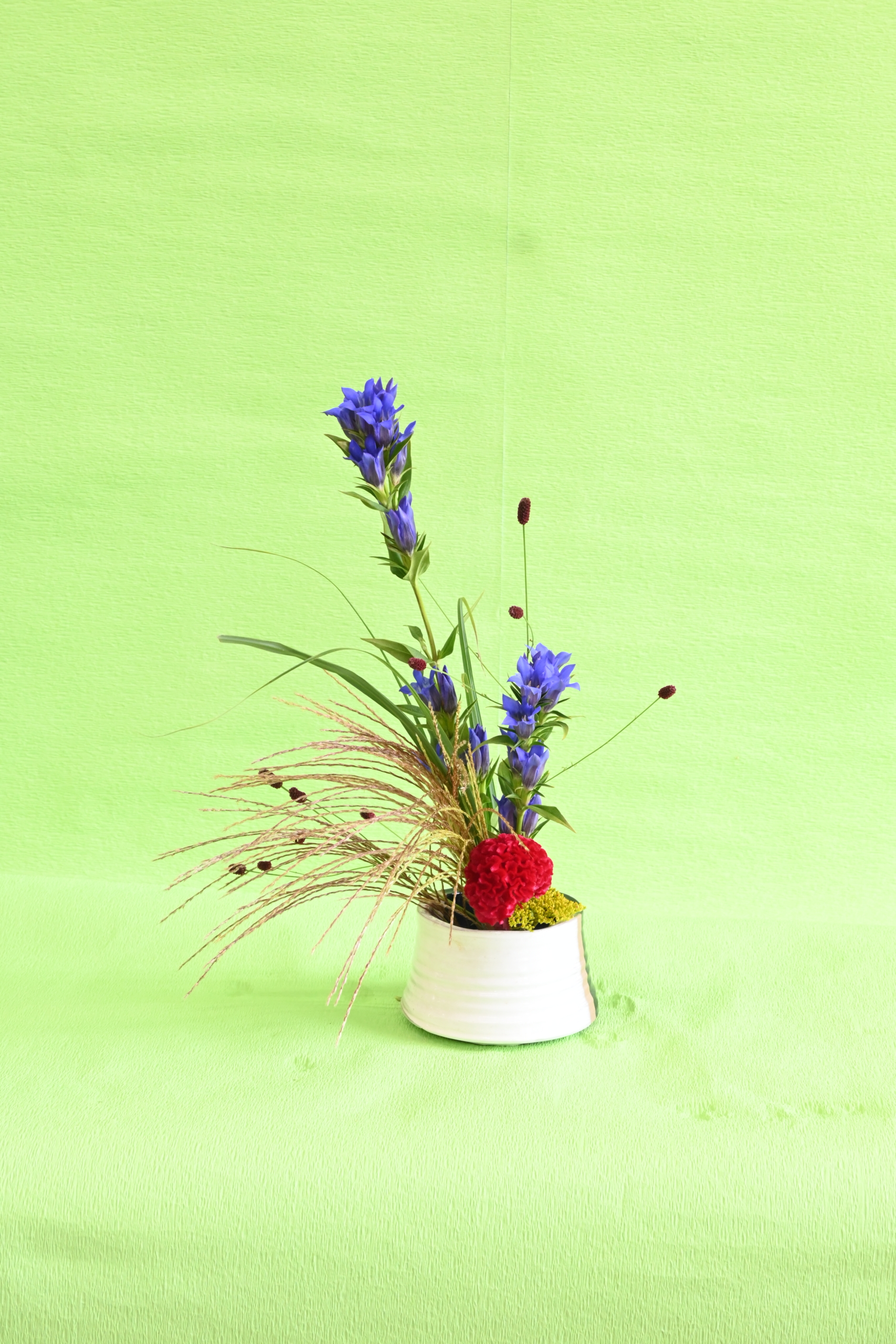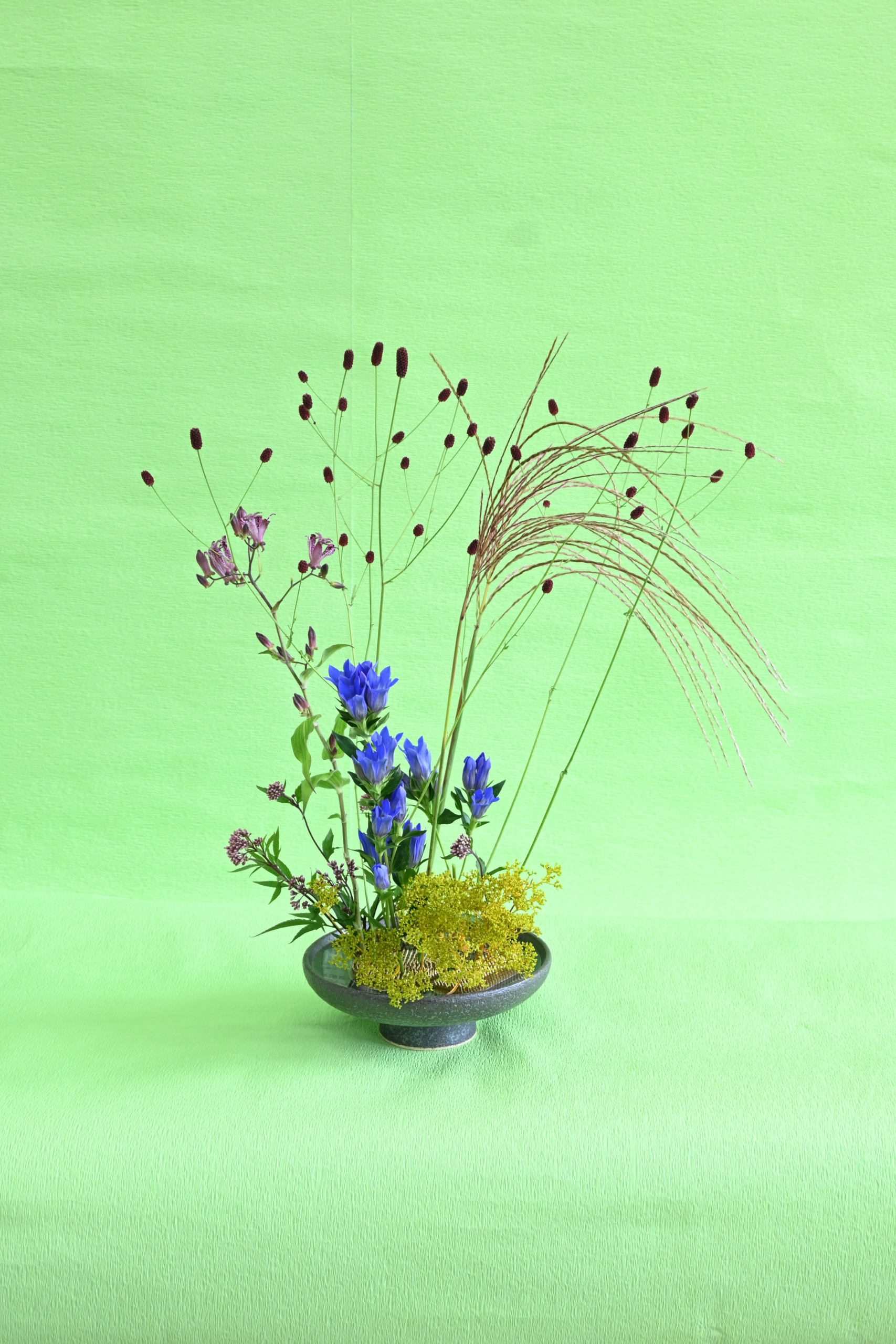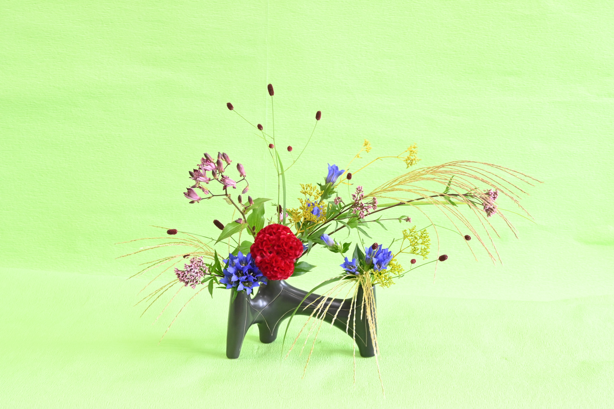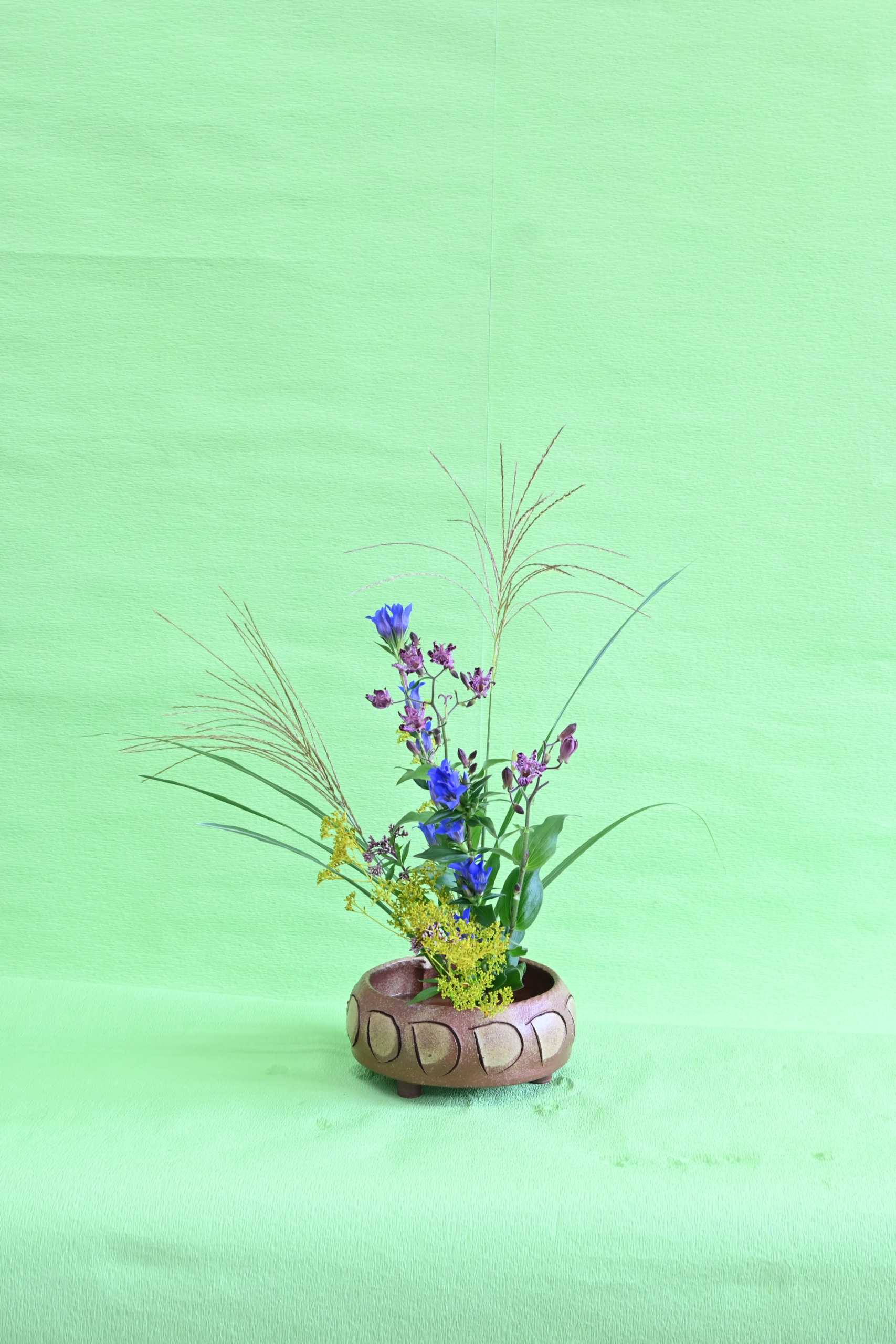 花材はススキ、リンドウ、ケイトウ、オミナエシ、ワレモコウ、ホトトギス、フジバカマです。