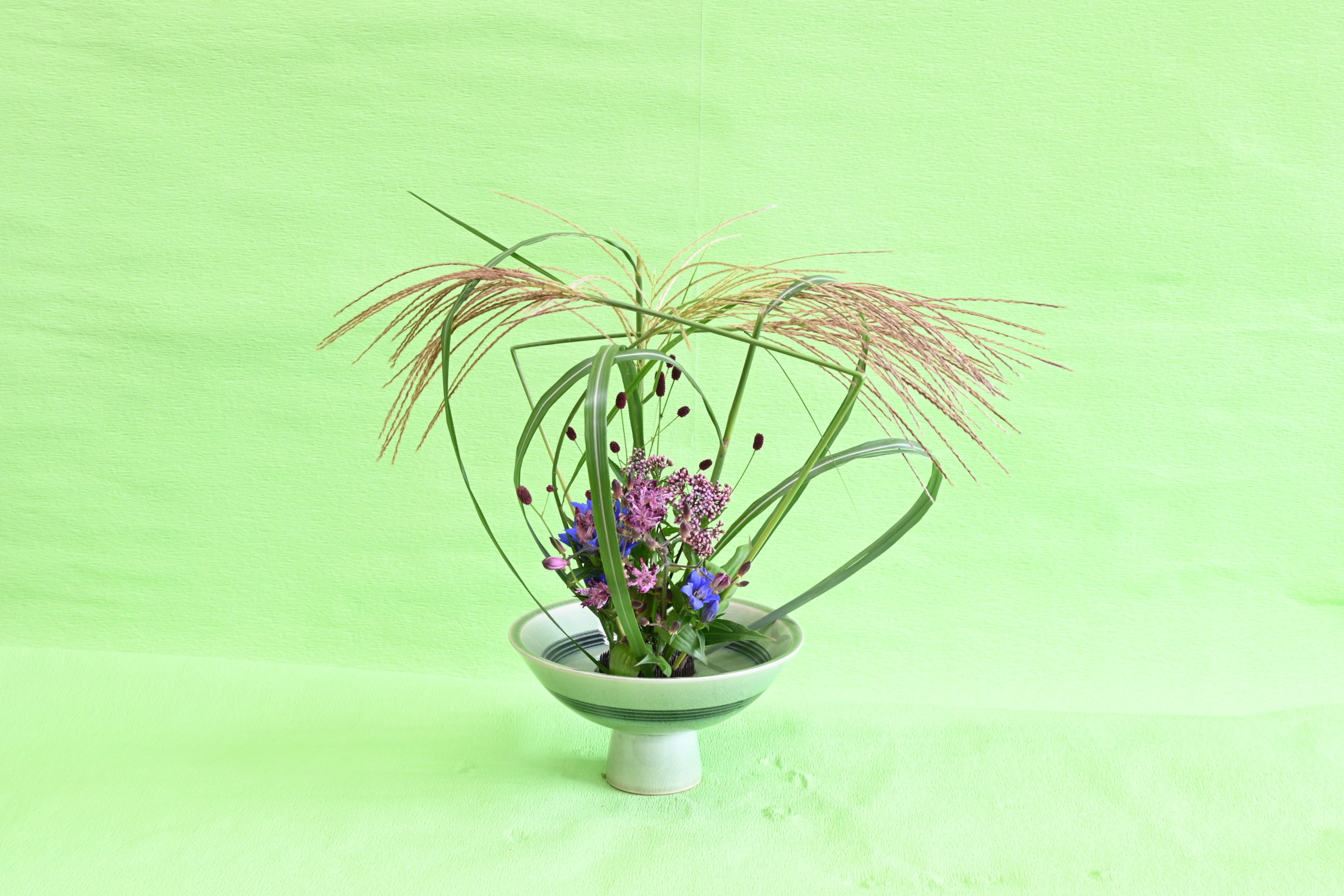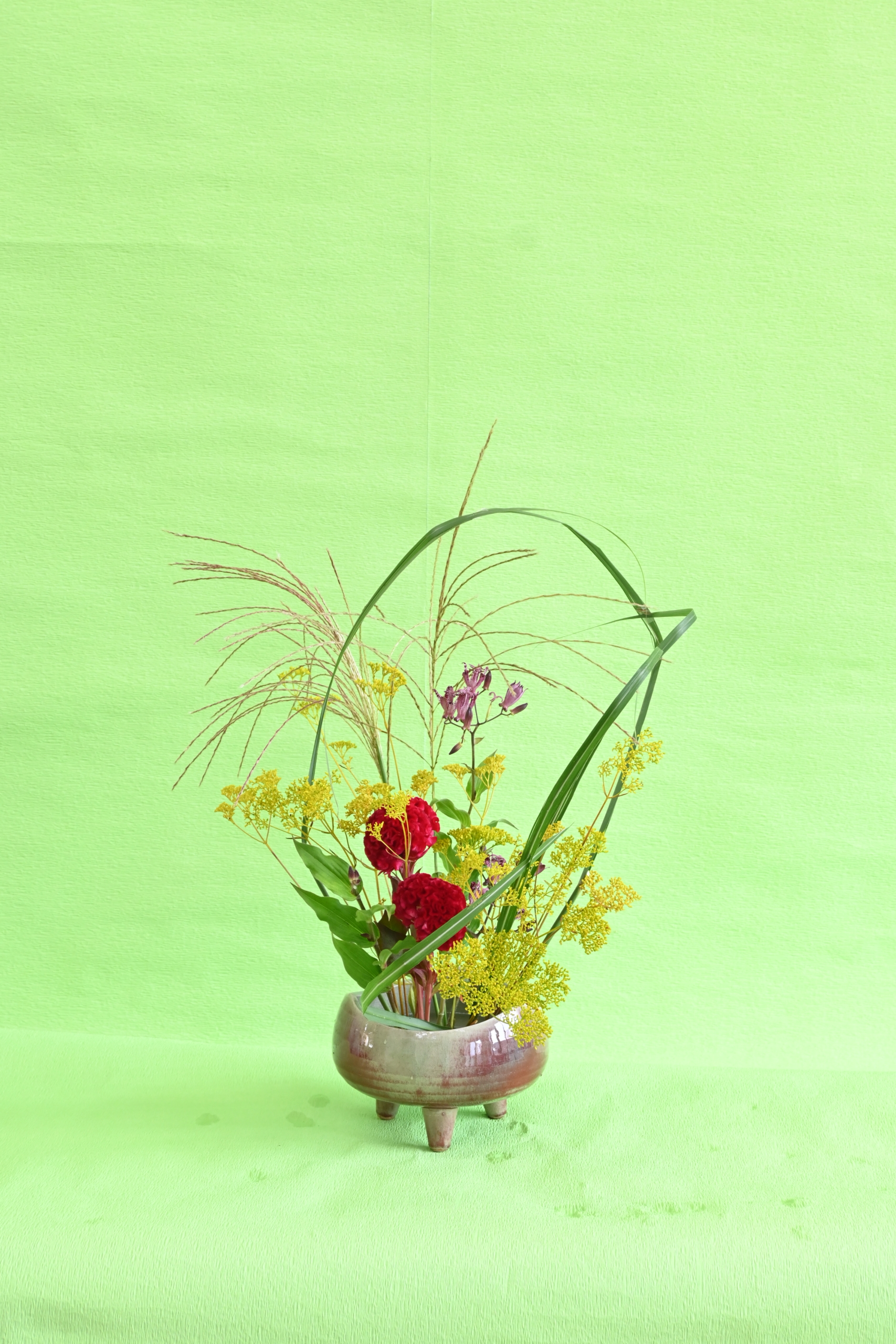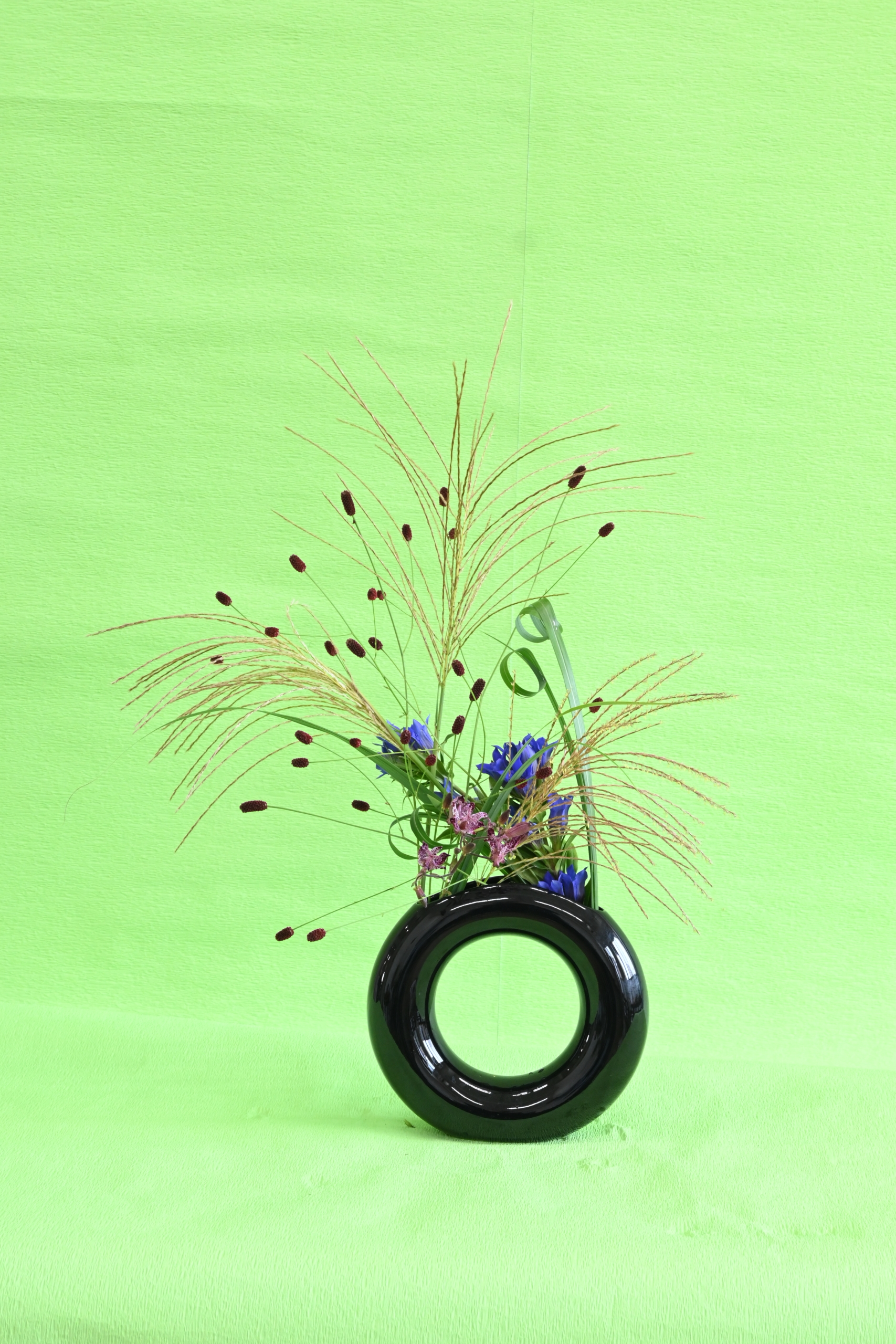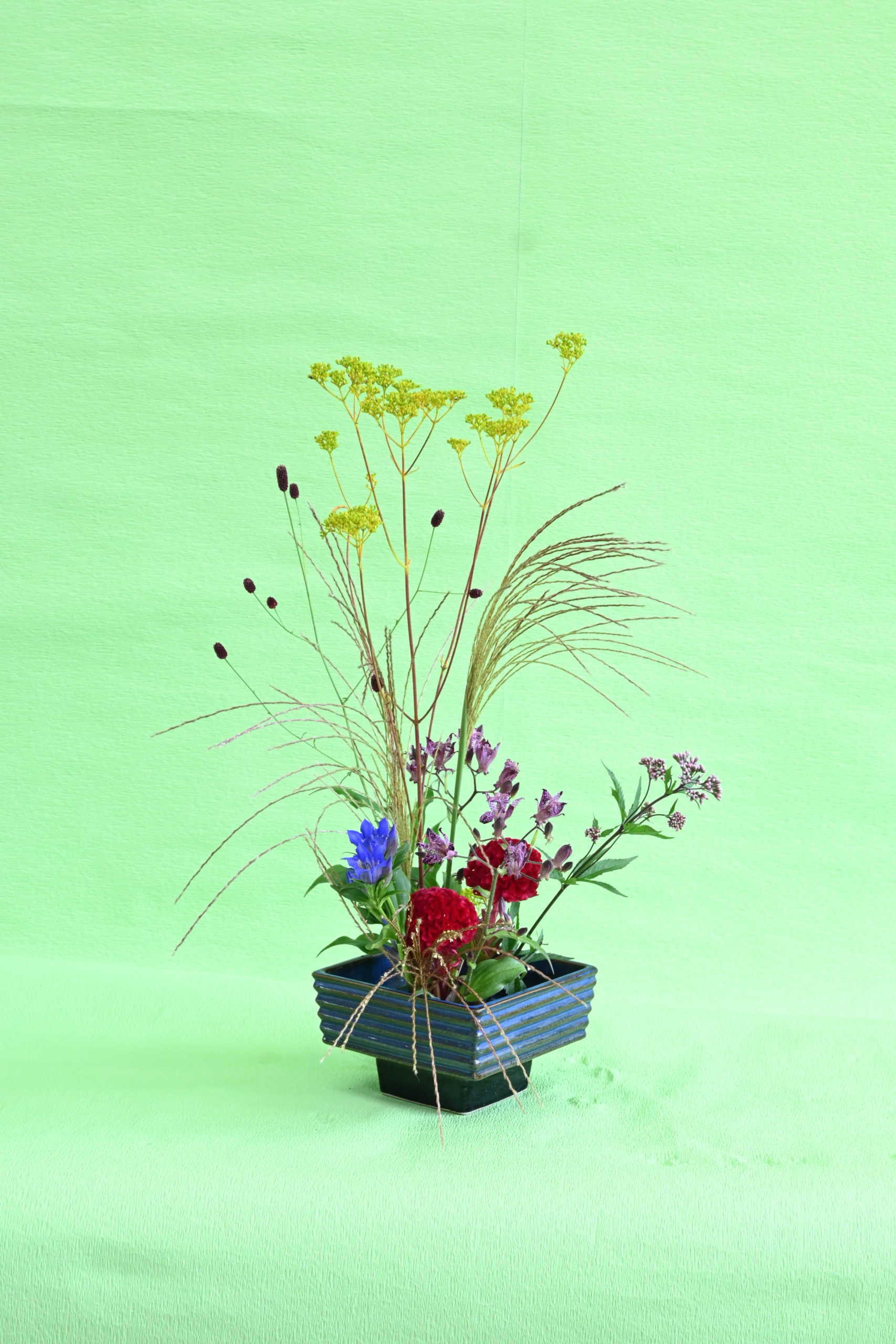 花材はススキ、リンドウ、ケイトウ、オミナエシ、ワレモコウ、ホトトギス、フジバカマです。
