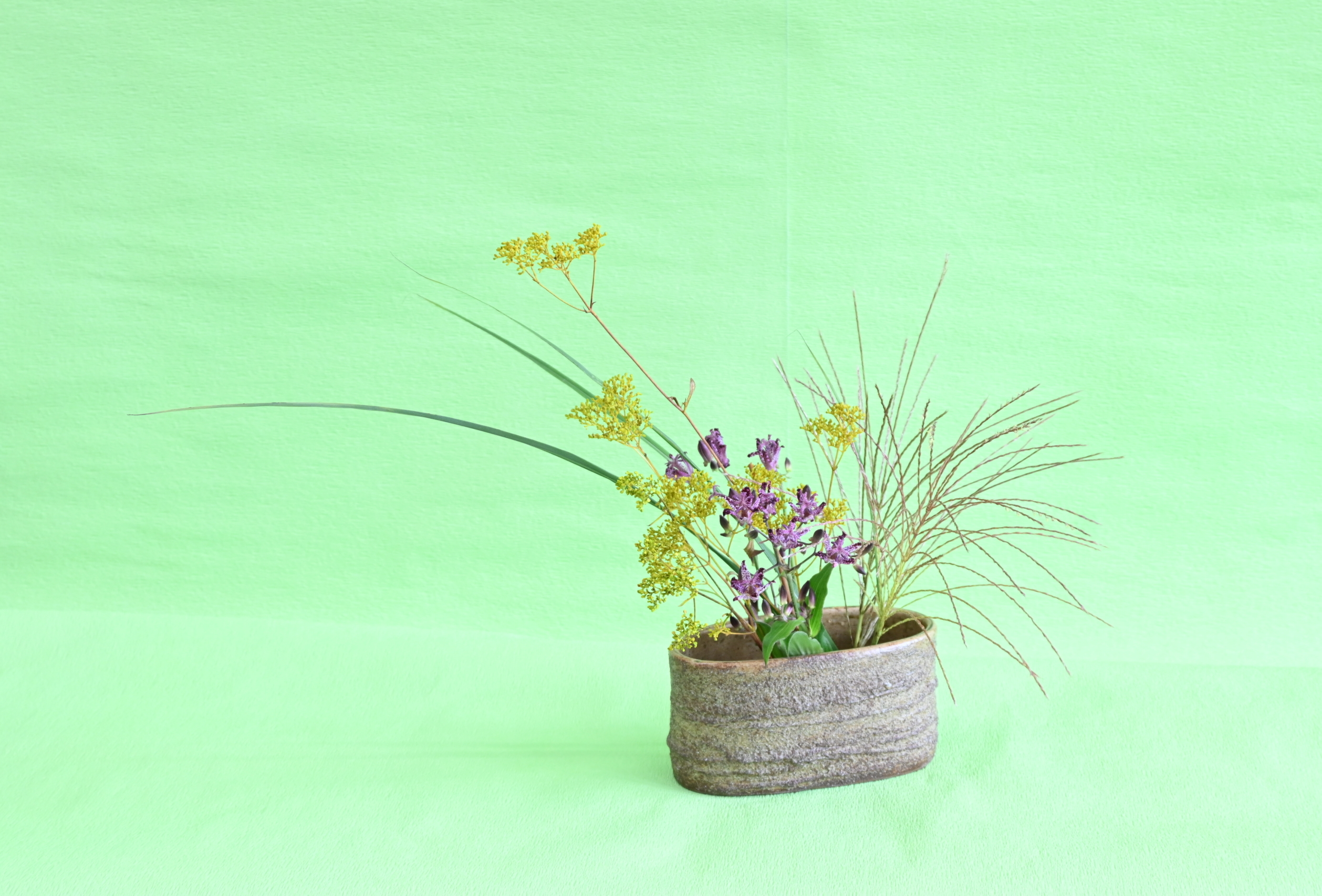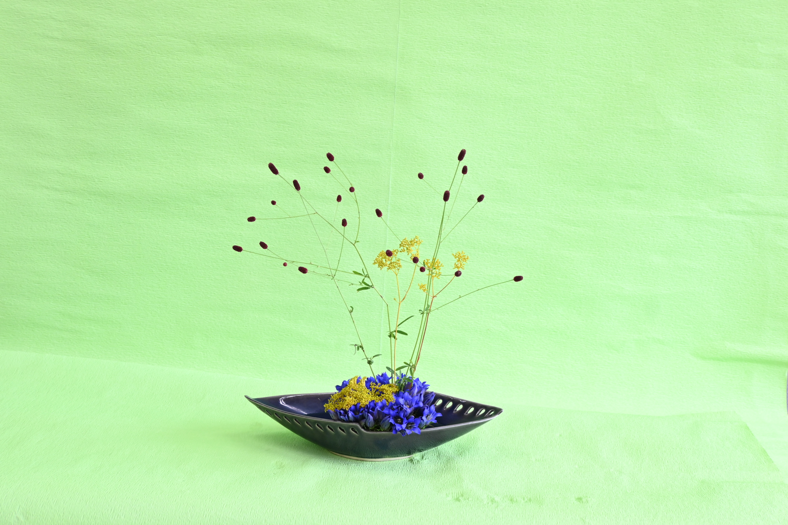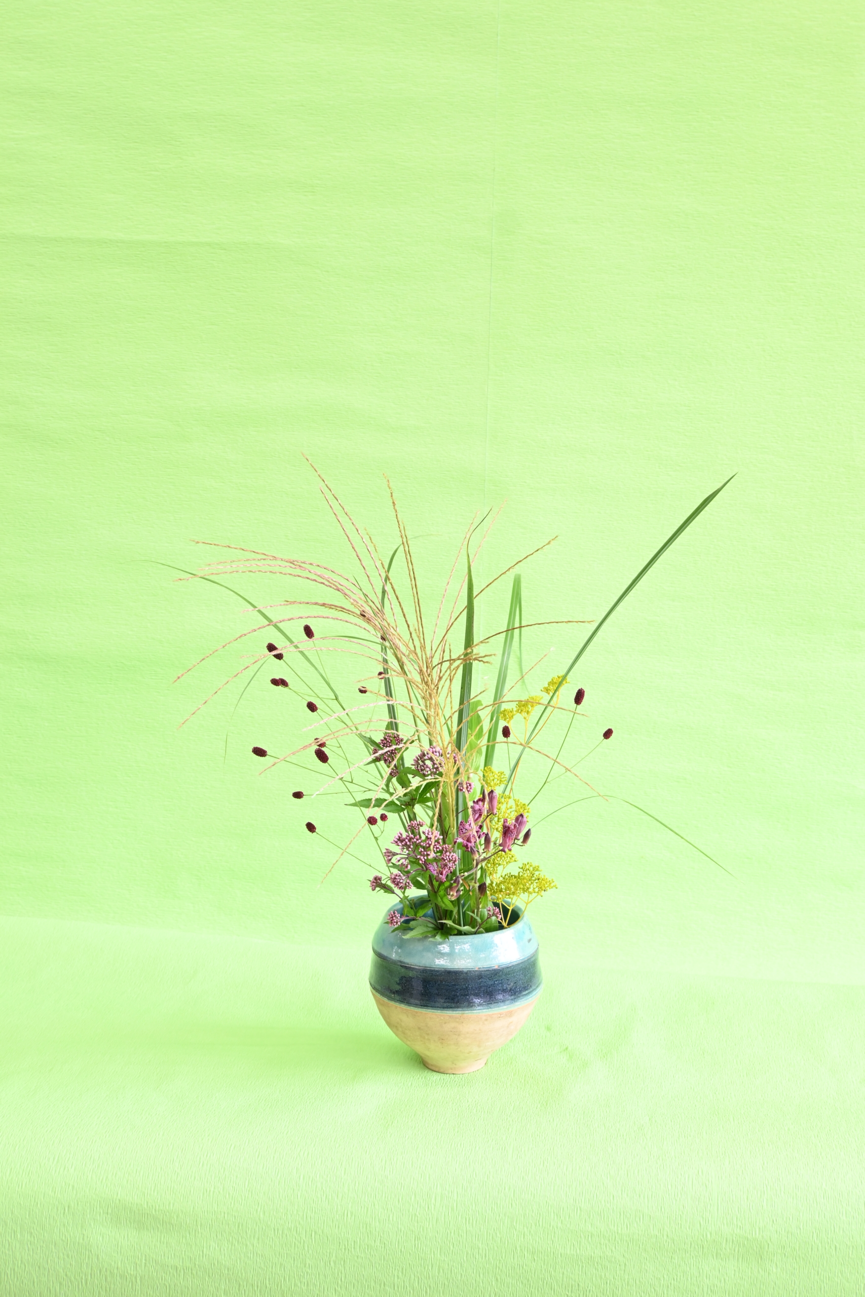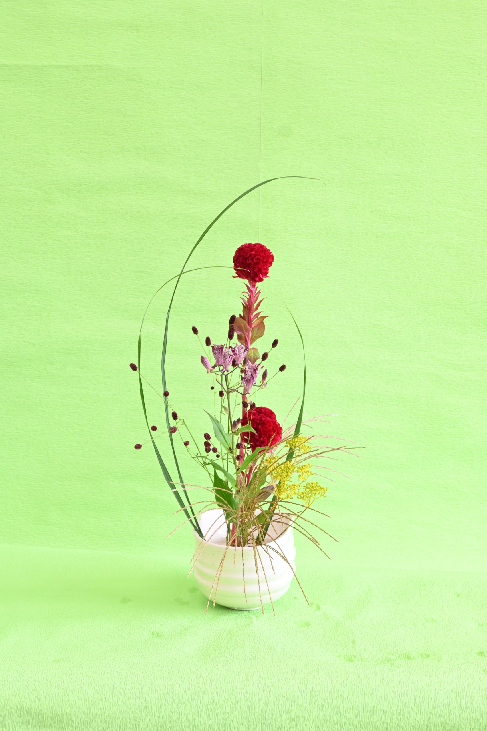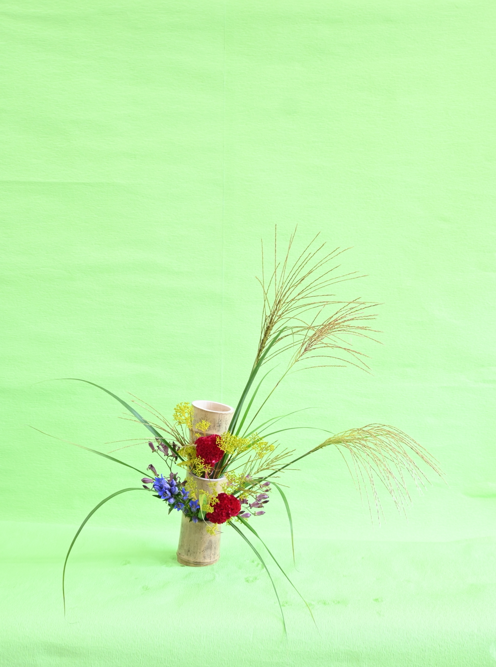 花材はススキ、リンドウ、ケイトウ、オミナエシ、ワレモコウ、ホトトギス、フジバカマです。